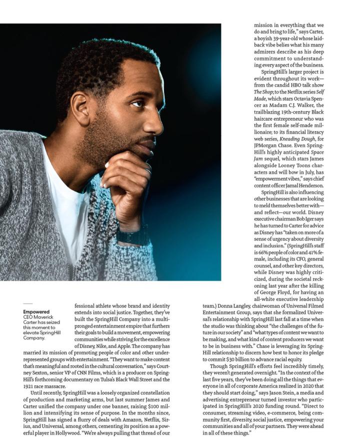 他登上权威商业财经媒体《快速公司》封面的组图。詹姆斯在这期封面采访中畅谈了他和友人创建的SpringHill媒体公司。他在社媒上表示“对于那些你说你会荣辱与共的身边人,假如你没有助力他们,那么你就是不是自己所描述的那种人!让我们继续将之提升至另一级别@SpringHill公司 !#不只是一个创业公司 #那些来自阿克伦的小孩”