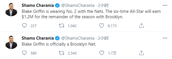 篮网队也已经正式官宣格里芬身披2号球衣,晒出格里芬身穿篮网2号的照片,并且发推写道:等不及看到格里芬穿上篮网球衣,周五正式首秀吗?