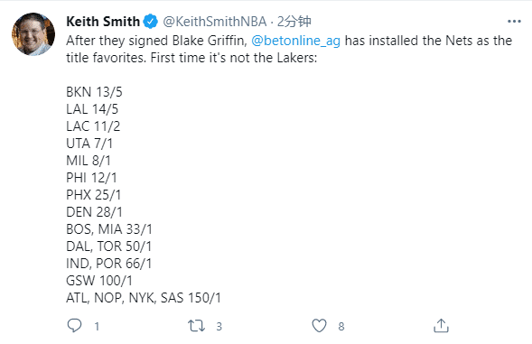 格里芬加盟篮网之后,最新的夺冠赔率出炉,篮网已经反超湖人成为新的头号夺冠热门,据名记Keith Smith报道,篮网已经成为夺冠大热门,本赛季首次力压湖人升到夺冠赔率第一名,目前篮网夺冠赔率13/5,湖人14/5,两队之间的差距并不大。