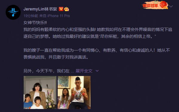 林书豪在赛后也更细社交媒体,他祝福女神节快乐(当地时间是3月8日),还感谢了自己的妈妈和嫂子,林书豪表示: