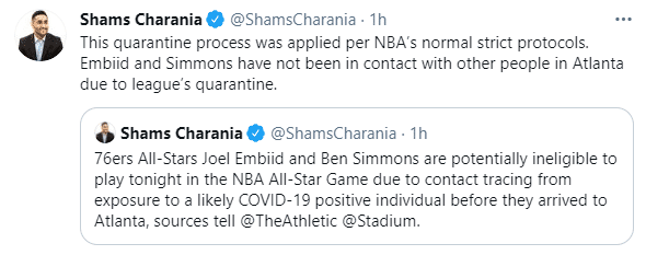来源:直播车03-08 20:06直播车讯北京时间3月8日,距离NBA全明星正赛只剩下不到8小时时间了,然而根据名记报道,NBA全明星名单将发生了变动,西蒙斯和恩比德因为接触了新冠阳性的理发师将缺席比赛,幸运的是西蒙斯和恩比德并未接触其他全明星球员,根据联盟规定,这两位全明星球员将在亚特兰特隔离,锡安将进入杜兰特队首发。