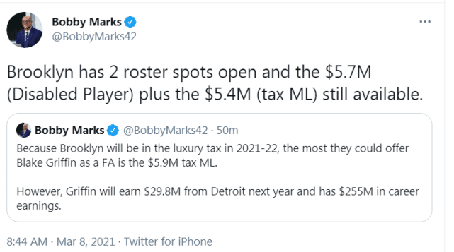 对于篮网来说,签下格里芬只是第一步,他们完全可以利用那两个名额,进一步提升本就强大的实力。马克斯表示,篮网在2021-22赛季将缴纳奢侈税,他们能给格里芬提供的最大的合同是590万美元的中产。