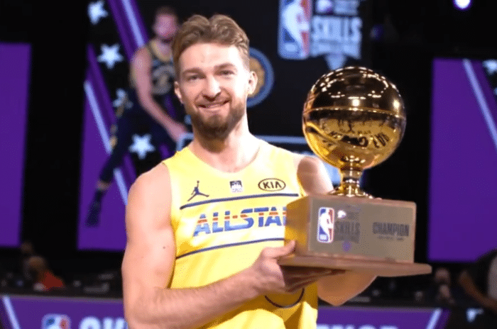 决赛武切维奇vs萨博尼斯,传球上篮都是一次命中,三分球两人前两投都是打铁,第三投萨博尼斯先命中,最终萨博尼斯获得技巧挑战赛冠军,小萨也是步行者队史上首位夺得技巧挑战赛冠军的球员。接下来进行的是全明星三分大赛,三分球大赛名单:库里、拉文、布克、米切尔、杰伦-布朗、塔图姆。