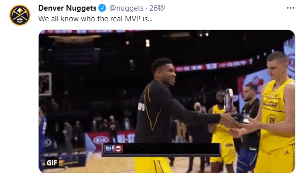 赛后有一点小插曲,字母哥把MVP递给约基奇,掘金官推写道:我们都知道谁才是真正的MVP;约基奇就像拿奖似的高举着炫耀,然后字母哥又要走了。