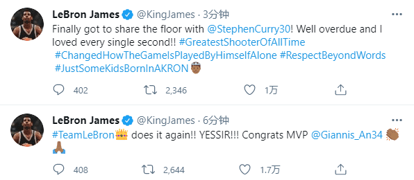 赛后詹姆斯更新社交媒体,发推恭喜詹姆斯队又一次做到了!恭喜字母哥赢得MVP;与此同时詹姆斯也发推写道:终于和库里同场竞技,珍惜我们在一起的每一秒钟。