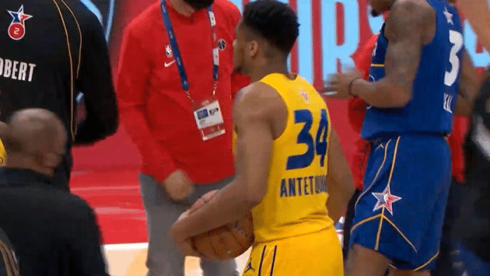 字母哥全场仅打19分钟16投16中狂砍全场最高的35分,帮助詹姆斯队20分大胜杜兰特队,力压库里当选全明星MVP也是实至名归,他对待比赛的态度十分认真;比赛刚结束,字母哥便第一时间紧紧抱住比赛用球,全程抱球不撒手,不过等待MVP的过程中,字母哥内心还是很不安的。