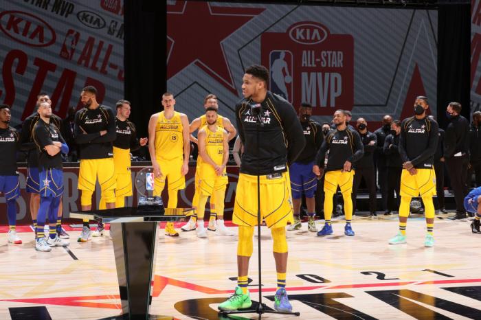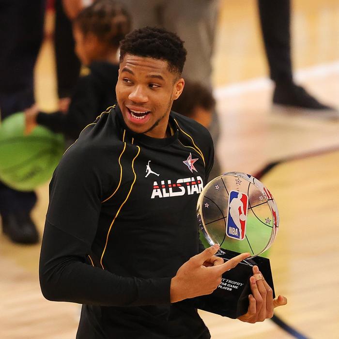 字母哥夺得科比-布莱恩特MVP奖杯创纪录,成为NBA历史首位夺得全明星MVP的欧洲球员;已夺得常规赛MVP、全明星赛MVP和DPOY,比肩乔丹和加内特成为NBA历史第三人;全明星赛至少出手10次且命中率100%,也是历史第一人。