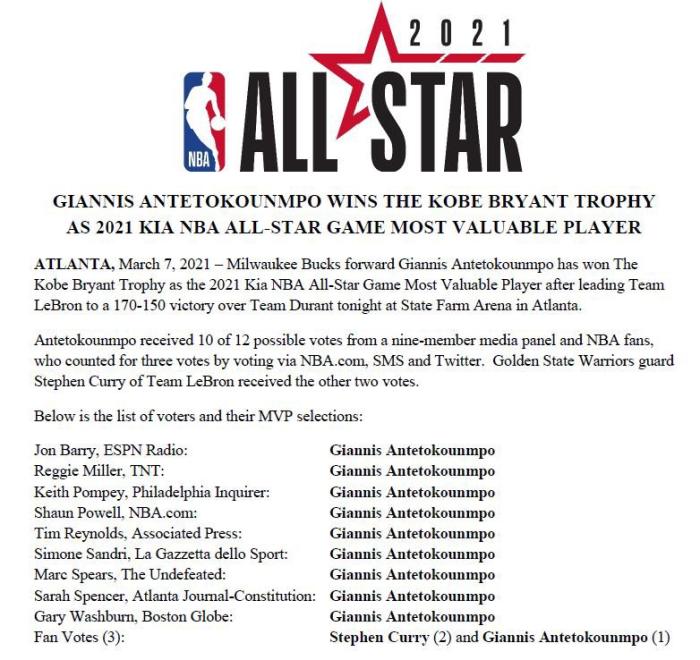 来源:直播车03-08 15:14直播车讯 北京时间3月8日,詹姆斯队170-150轻松大胜杜兰特队,雄鹿球星字母哥力压库里当选全明星赛MVP,赛后全明星MVP投票结果出炉,字母哥获得大多数投票,所有媒体都支持他。