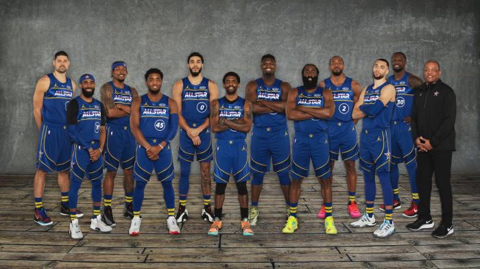 前排五大球星:库里、保罗、詹姆斯、利拉德和杰伦-布朗,詹姆斯双手抱球站在C位,詹姆斯队主帅斯奈德站在边上。