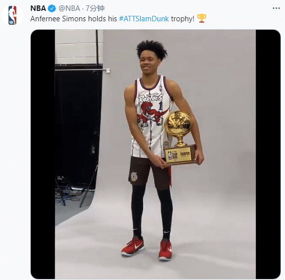 开拓者球员安芬尼-西蒙斯夺得扣篮冠军,本想亲吻篮筐却突然退缩,但他仍旧夺得扣篮王。