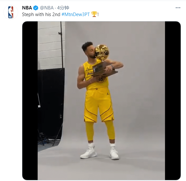 库里绝杀康利夺得三分冠军,拍摄捧杯定妆照时,库里亲吻奖杯。