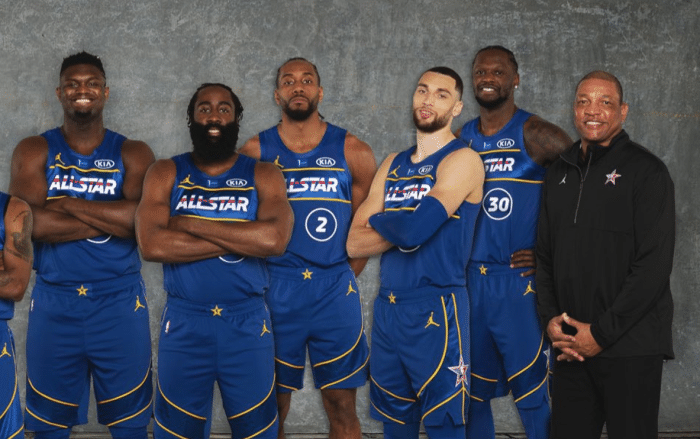 后排六大球星:武切维奇、比尔、塔图姆、锡安、小卡和兰德尔,杜兰特队主教练老里弗斯同样靠边站。
