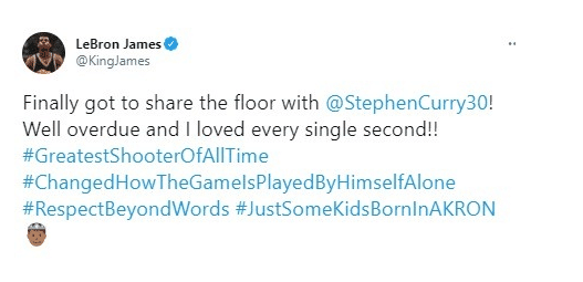 “我终于和你队啦!@库里 这一刻来得太迟了!我爱和你在一起的每一秒!!#历史最伟大射手#由他一人改变了比赛的方式#除了尊敬没有什么可以形容#两个出生在阿克伦的小孩”