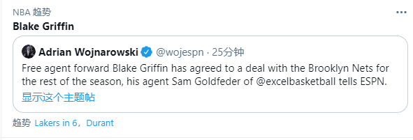 来源:直播车03-08 11:55直播车讯 北京时间3月8日,在NBA亚特兰大全明星赛这一天,格里芬下家终于确定下来,先是shams报道篮网预计签约格里芬,然后ESPN名记报道格里芬已经同意签约篮网,格里芬的经纪人证实了这一重磅新闻,目前只差篮网正式官宣。