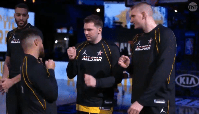 由于东契奇正在专注于和约基奇闲聊,库里和戈贝尔击拳后,突然大喊一声吓得东契奇表情突变,然后东契奇微笑着库里击拳,这一幕太有趣。