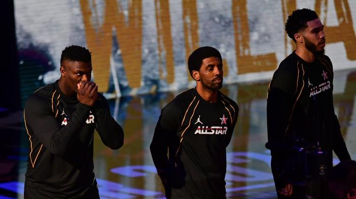 杜兰特队率先亮相,哈登双手抄兜十分帅气,本场第一个亮相的球星,然后杜兰特队其他球星先后亮相,锡安、欧文以及塔图姆等人站成一排。