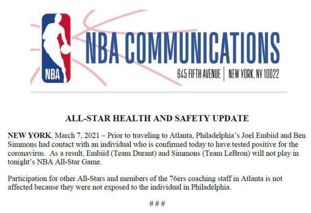 距离全明星赛开始还有几个小时,费城方面的恩比德和西蒙斯却突然宣布将缺席全明星赛,虽然这两人的缺席不会直接影响到比赛的进行,但是一下子少了两名球星,球迷们还是接受不了的。