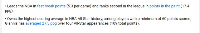 全明星赛上的快攻机会不少,而赛季至今,字母哥场均快攻得分5.3分,排在联盟第一位,换言之,他是全联盟快攻得分最强的球员。他的场均内线得分达到17.4分,排在联盟第二。上赛季的全明星赛,字母哥队两分惜败于詹姆斯队,但内线得分方面,字母哥队以108-66大幅领先。