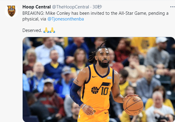 迈克-康利终于成为全明星球员,职业生涯14年首次入选全明星阵容,这一次是联盟为他开绿灯;33岁康利是爵士排名联盟第一的关键球员,本赛季首发出战29场比赛,场均上场29.4分钟能够轰下16.1分3.5篮板5.7助攻1.4抢断,今年将会成为全明星替补的一员。