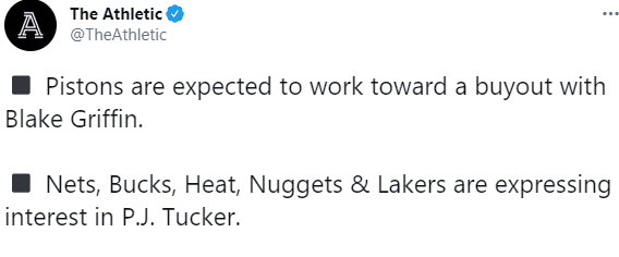 来源:直播车03-05 19:21直播车讯 北京时间3月5日,据名记Shams爆料,预计活塞很快将买断格里芬,分期支付他余下的薪水,让他成为自由球员签约其他球队!