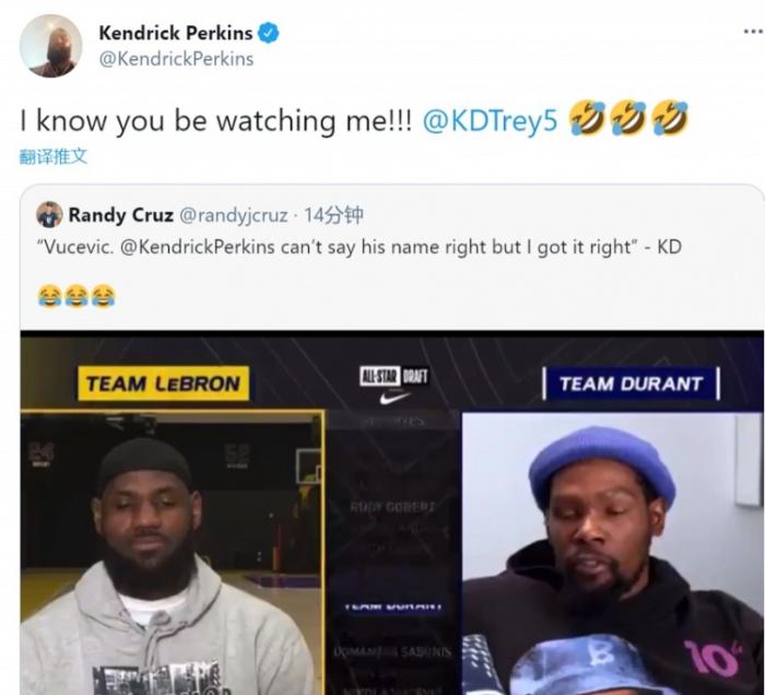 另外在杜兰特选择武切维奇的时候,他嘴里还念念有词“武切维奇!我知道帕金斯说不对你的名字,但我可以”帕金斯转发图片附文打趣“我只懂你一直在看着我!”武切维奇是黑山人,名字也比较复杂,这可能是两人调侃的原因!