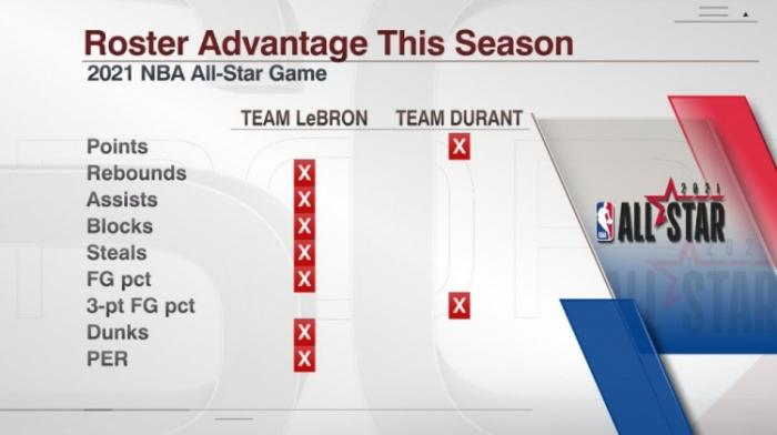 据统计,詹姆斯队的工资总额为3.57亿美元,杜兰特队的工资总额为2.87亿美元(杜兰特因伤不能参赛,他的工资未计入其中)。另外美媒还晒出了两队的各项数据统计,杜兰特队仅在得分和三分命中率这两项数据上领先詹姆斯队,其余包括篮板、助攻、盖帽、抢断在内等多项数据均落后于詹姆斯队。