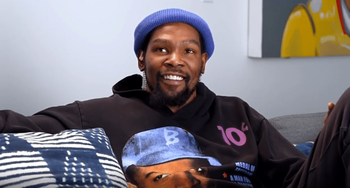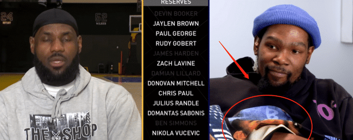 其中还有个小细节比较有趣,当时两人在挑选替补阵容,而杜兰特可能突然感觉胸部或者肩膀有些痒痒了,就忍不住面对着镜头从帽衫前面直接伸手进去挠痒痒,显得有点旁若无人的感觉,毕竟这是面对镜头啊,杜兰特不感觉羞羞吗?你可是NBA顶级球星,赚着年薪几千万美金的富豪啊!