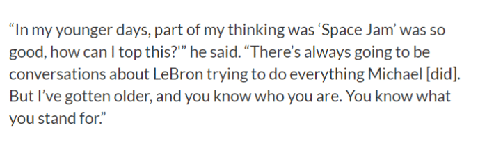 詹姆斯表示,自己还没和乔丹就这部电影有过任何交流,但他希望如果乔丹观看了这部电影,能够认可他的表现。“在我年轻的时候,一部分想法是《空中大灌篮》太棒了,我怎么做才能超越它?”詹姆斯说道,“总有人说我喜欢做乔丹做过的事,但随着年龄的增长,你知道自己是谁,也明白自己代表着什么。”