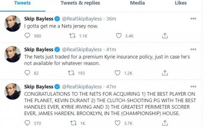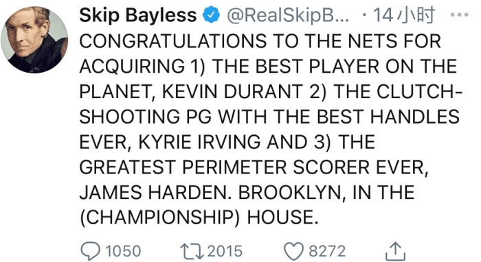 当篮网组成三巨头,同时表现抢眼的时候,Skip Bayless除了盛赞篮网,还不忘贬低詹姆斯,称:“跟詹姆斯说晚安。”