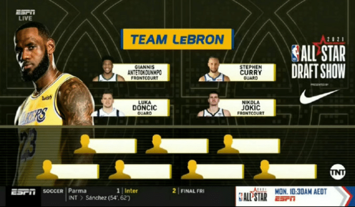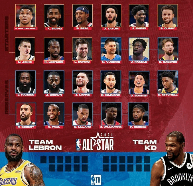 詹姆斯队首发:詹姆斯、字母哥、库里、东契奇、约基奇;