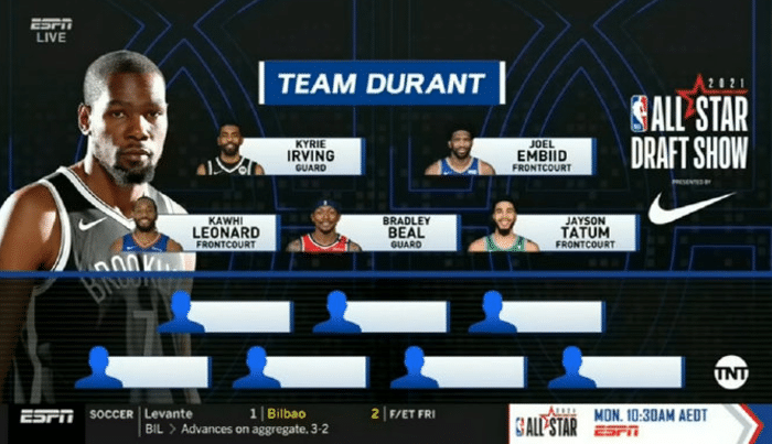 杜兰特队首发:欧文、恩比德、莱昂纳德、比尔、塔图姆;