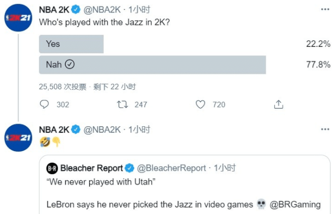 詹姆斯的言论谈到了“游戏中不会选择爵士”,很快知名篮球游戏2K就发起了投票,称:“你会在2K里选择爵士吗?”