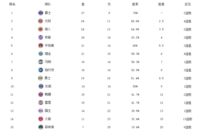 西部最新排名!太阳4连胜力压湖人,快船首吞3连败,森林狼垫底