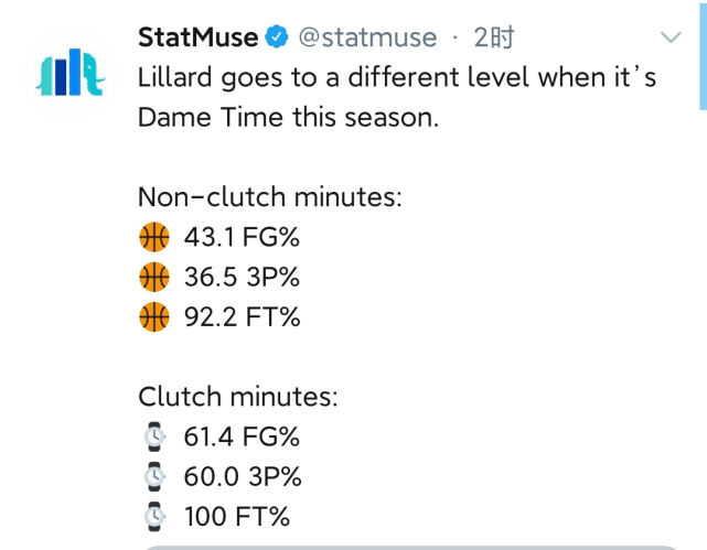 关键时刻的利拉德,三项数据排名第一,他是联盟里这个时间最可怕的对手!StatMuse还拿出了利拉德非关键时刻的数据,来进行横向比较。非关键时刻,利拉德投篮命中率43.1%,三分命中率36.5%,罚球命中率92.2%,还算不错但没有给人很大的威胁感。再看看关键时刻,这三项数据分别变成61.4%,60%和100%,简直像是调成了超人无敌的模式。