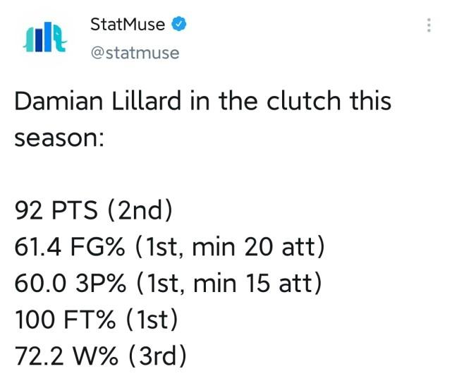 数据网站StatMuse显示,本赛季至今,利拉德在关键时刻(比赛最后5分钟分差5分以内的时段)的总得分92分,排在联盟第2位,投篮命中率61.5%,在所有至少20次出手的球员里排名第一,三分命中率60%,在所有至少15次三分出手的球员里排名第一,罚球命中率100%,并列第一,胜率72.2%,排名第三。