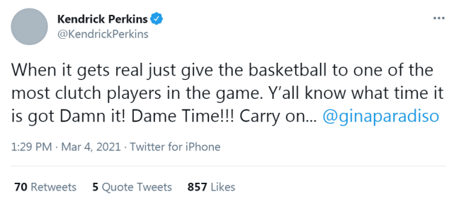NBA评论员帕金斯在社媒上写道:“在关键时刻,要把篮球交给场上最关键的球员,你们都知道那是什么时刻——达米安(利拉德)时刻!”