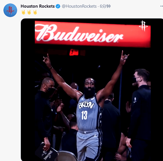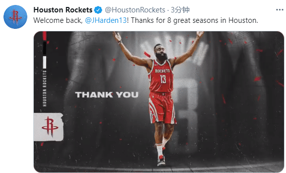 火箭官方连续更新动态,先是发推写道:欢迎回来,感谢哈登为火箭效力8年;然后用双手合十和爱的表情包感谢哈登;哈登的这两个手势表达了对火箭以及现场球迷满满的爱,如此画面很感人,虽然哈登已经和火箭分手,但双方相互致敬,爱意满满。