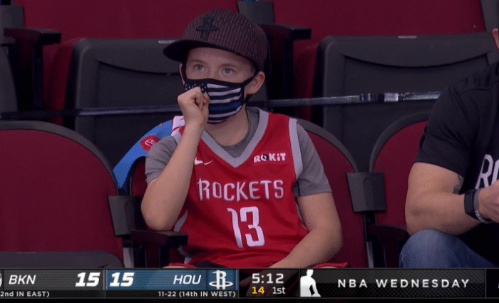 在丰田中心球馆,现场有些球迷起立欢呼,也有少数球迷嘘他,不过现场一位小球迷身穿哈登火箭时期13号球衣十分抢镜;此前火箭老板费尔蒂塔已经明确表态,哈登永远都是火箭人,未来某一天会退役哈登13号球衣;退役球衣,这是对哈登8年火箭生涯的最大肯定和认可,如此荣誉也是当之无愧的。
