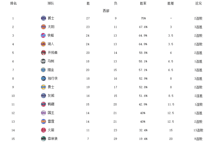 爵士今天很可惜,末节一度占据明显优势,无奈被费城扳平,加时赛遗憾输了球,最近4场,他们输了3场。太阳昨天击败湖人之后排名提升,这个赛季布克和保罗有望取得好成绩。快船也吃到连败,他们距离榜首之间有3.5个胜差。湖人今天在没有詹眉组合的情况下对阵国王,他们遗憾的以3分劣势输了球。开拓者今天对阵勇士,依靠着最后时刻利拉德的关键攻防,开拓者2分优势险胜勇士。马刺这个赛季是西部惊喜,波波维奇的球队战绩是18胜13负。掘金拿下3连胜,在约基奇的带领下他们表现出色。独行侠在波尔津吉斯的带领下击败了雷霆,他们拿下了一波3连胜。