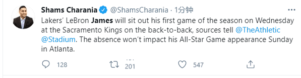 来源:直播车03-03 19:07直播车讯北京时间3月3日,名记Shams在湖人输给太阳的比赛后爆料,湖人对阵国王的背靠背的比赛中,詹姆斯将轮休。这是这位36岁的老将,本赛季第一次轮休。