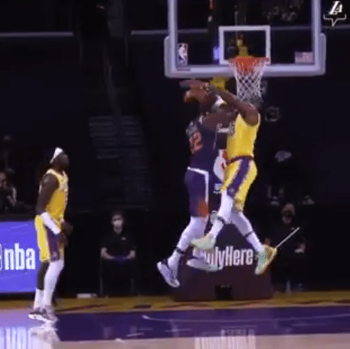 艾顿持球想攻击篮筐得分,岂料此时詹姆斯拼命大帽艾顿,空中拦截上演不可思议的盖帽,老詹身体失去平衡直接摔倒,用身体堵抢眼太拼了,不过眼看湖人开始打反击,詹姆斯赶紧爬起来,然后快速跑回去参与进攻,这一个回合凸显詹姆斯对待比赛的态度。