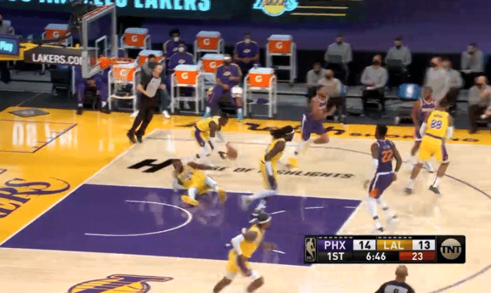 比赛正式开打后,太阳内外同时开火,克劳德和布里奇斯接连投进三分,艾顿在内线强打得分;随后大莫里斯为湖人率先得分,然后詹姆斯开始得分,施罗德打板三分也有,紧接着老詹内线单打艾顿,极限后仰跳投得分,湖人已经追回比分。