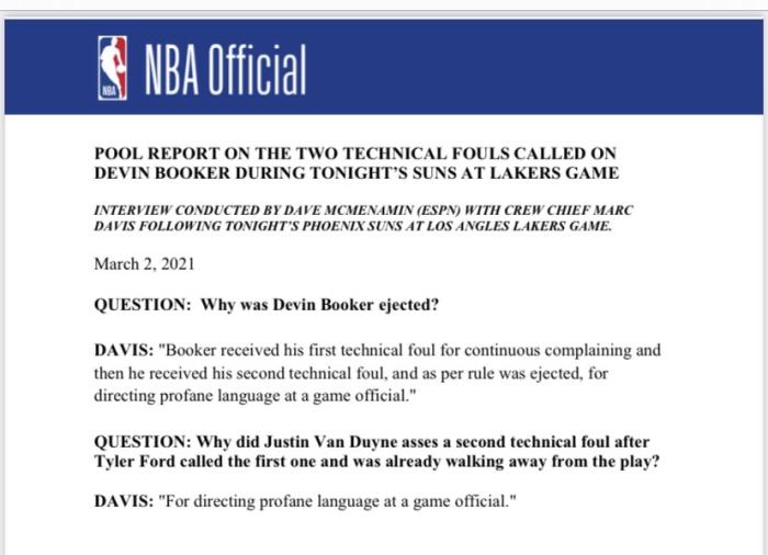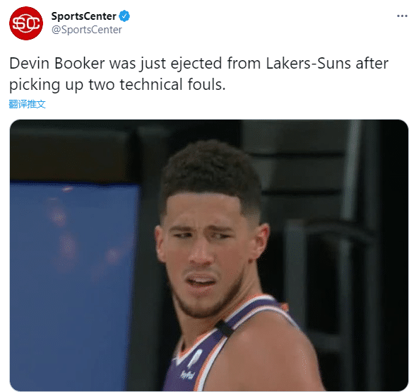 NBA官方公布裁判报告,当值主裁马克-戴维斯解释驱逐布克的真相;主裁解释:布克吃到第一次技犯是因为他不断抱怨裁判,而他的第二个技犯则是因为对裁判使用了亵渎的语言,这就是布克连吃两T遭驱逐的前因后果;本场比赛,布克首发出战23分钟12投7中轰下17分6助攻3篮板3抢断,惨遭驱逐离场。