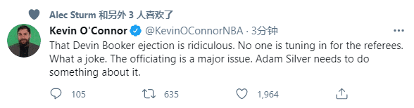 布克遭驱逐瞬间登上推特引争议,当时名记奥康纳发推炮轰裁判吹罚太荒谬,简直就是一个笑话,联盟总裁该管管了;名嘴史密斯则是质疑裁判,因为一些无关紧要的琐事就把布克驱逐了吗?美媒Sports Center晒出布克遭驱逐时的反应:一脸不敢相信的表情。当时詹姆斯对这样的结果也十分震惊,面部表情十分抢镜。