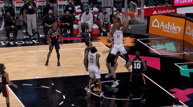 本场比赛克拉克斯顿的高光时刻来自第二节,哈登和欧文连续送出助攻,直接抛到天上,克拉克斯顿也是心领神会,直接暴扣。同时克拉克斯顿和哈登之间的配合非常默契,两人打挡拆之后哈登给到顺下的克拉克斯顿,他直接迎着马刺的防守球员双手扣篮,也点燃了篮网替补席的激情。