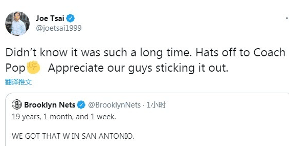 作为篮网的老板,蔡崇信一直都在关注着球队的比赛,此前篮网西部客场5连胜之后蔡崇信也发文感谢球员们的表现。而今天当篮网时隔19年再度征服马刺主场的时候,蔡崇信也发文感慨,感谢队员们在赛场上的表现,同时对于波波维奇脱帽致敬,要知道的是篮网和马刺每个赛季都交手,但连续19年都可以在主场击败篮网,也说明了马刺的表现是持续稳定的。