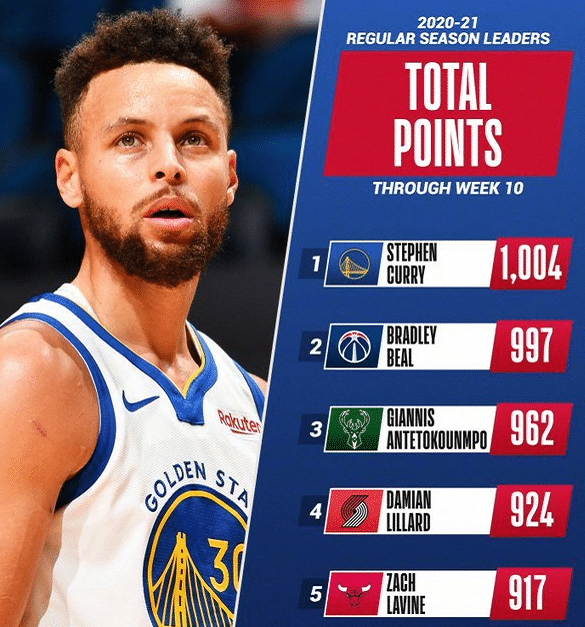 总分上,库里得分来到1004分,位居联盟第一,比第二名的比尔997分高出了7分,不过比尔出战的场次比库里少4场,所以场均得分比尔更高。字母哥962分排名第三,利拉德924分位居第四名,本赛季蜕变的公牛核心拉文917分表现抢眼。