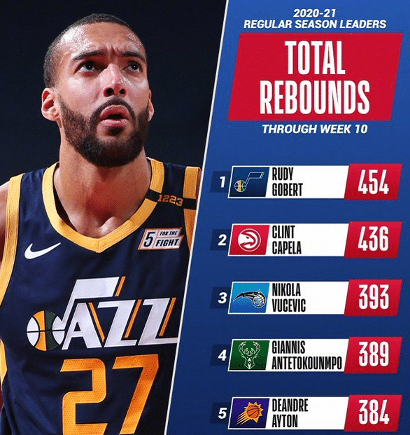 篮板层面,戈贝尔总篮板数454个排名第一,卡佩拉场均篮板14.1第一,两人都是联盟公认的篮下怪兽,其中戈贝尔带领的爵士战绩高居联盟第一。卡佩拉长时间占据场均篮板榜首的位置,他的发挥很稳定。