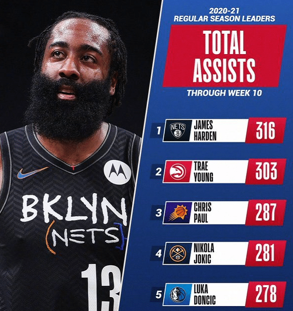 哈登是助攻总榜和场均助攻联盟第一的球员,本赛季哈登已经贡献了316次助攻,力压特雷杨和老队友保罗。场均助攻,哈登10.9次,韦少场均9.6次助攻排名第二,特雷杨场均9.5次助攻。哈登来到篮网之后迎来蜕变,场均10+的助攻已经成为了家常便饭,转型为控卫的他这个赛季很有希望冲击总冠军。