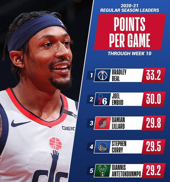 比尔以场均33.2分位居联盟得分王,但在总得分榜上,他并不是第一名,排名第一的是勇士核心库里,本赛季至今库里已经得到了1004分,他也是本赛季第一个打破1000分大关的球员。